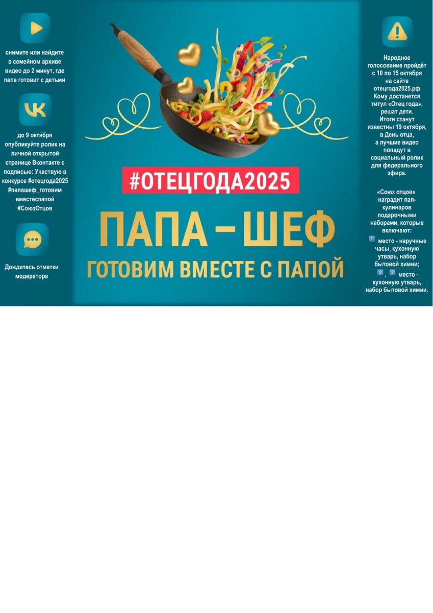 18 сентября АНО «Национальные приоритеты» при координирующей поддержке Министерства труда и социальной защиты Российской Федерации и активном участии ВОО «Союз отцов» инициировала проведение конкурса пользовательского видео «Отец года». Данный проект направлен на выявление и демонстрацию уникальных паттернов взаимодействия между отцами и детьми, а также на анализ формируемой ими особой воспитательной и рекреационной среды. В рамках конкурса будут представлены видеоматериалы, иллюстрирующие вклад отцов в развитие и социализацию детей, их роль в формировании компетенций. Одной из номинаций является «Папа-шеф. Готовим вместе с папой». Номинация «Папа-шеф» – это проект «Союза отцов», в котором помимо активного участия в воспитании и образовании детей, папы могут проявить творчество на кухне и научить детей приготовлению блюд, следуя традициям, перенятым от своих родителей. Наш проект не просто про вкусную еду, а трансляция создания и передачи традиций своим детям. Мы знаем, что наши мужчины - не только герои, защищающие Родину, но и герои семейного тыла, помогающие своим супругам организовать свою семейную жизнь гармонично в полной взаимопомощи. Благодаря таким отцам, женщины чувствуют себя любимыми, а дети – активными участниками семьи. Для участия необходимо снять или выбрать из семейного архива видеоролик продолжительностью до двух минут, где папы совместно с детьми: готовят, вдохновляют, делают обычные вещи необычно. Опубликовать до 9 октября 2025 года его на личной открытой странице в социальной сети «ВКонтакте» и подписать: «Участвую в конкурсе #отецгода2025#папашеф_готовимвместеспапой #СоюзОтцов». С 10 по 15 октября состоится народное голосование на сайте конкурса отецгода2025.рф, в итоге которого будут выбраны пять финалистов. Итоги будут опубликованы в День отца, 19 октября.